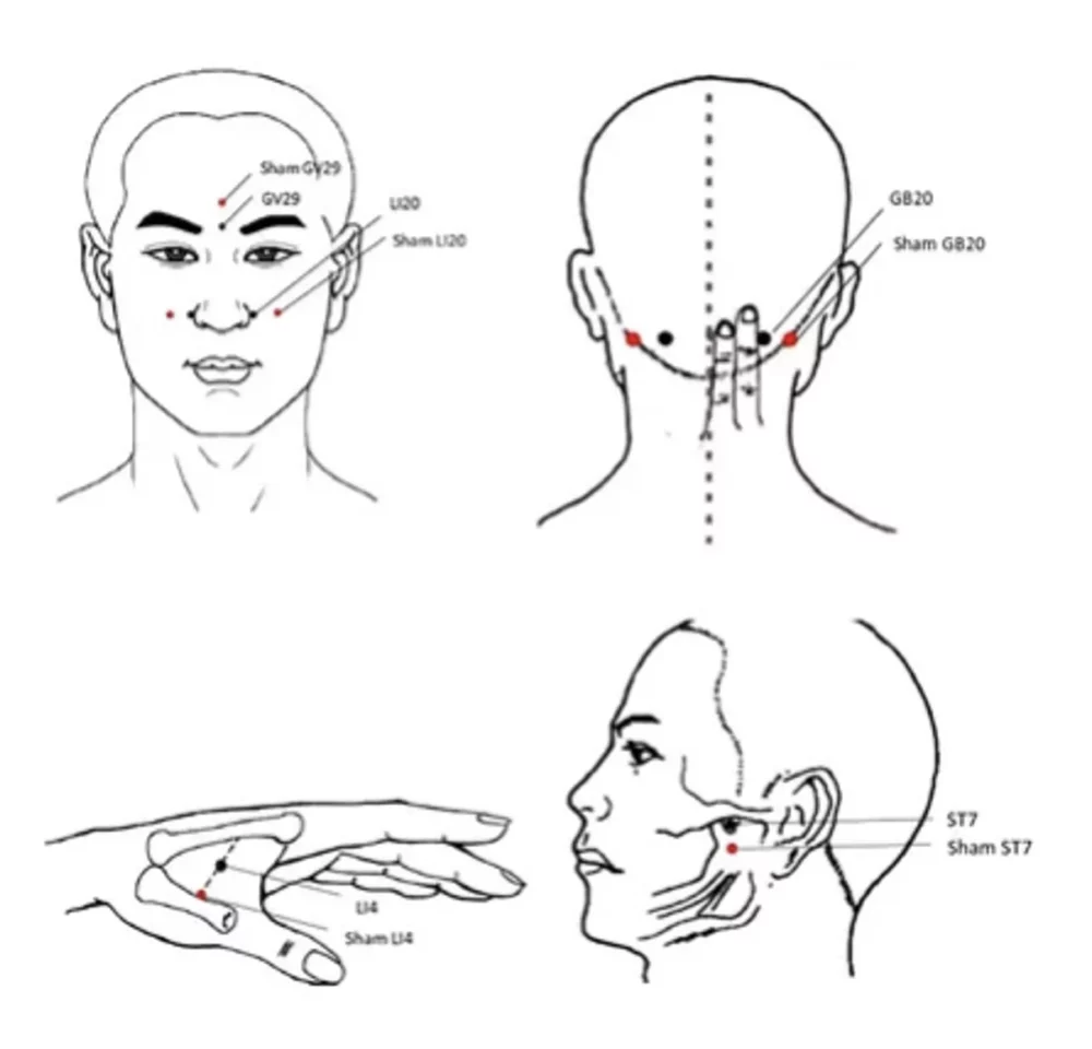 จุดฝังเข็มที่นิยมใช้ในการรักษาได้แก่: LI20 (อิ๋งเซียง), ST7 (เซี่ยกวาน), GB20 (เฟิงฉือ), LI4 (เหอกู่), GV29 (ยิ่นถัง)